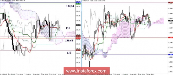 During the last couple of days, the pair is busy overcoming the attraction of the resistance levels passed the day before. The day Tenkan and the upper boundary of the cloud H4, but it is not possible to get rid of their influence and leave the zone. Exit from the zone of consolidation and attraction will open up prospects for an uptrend. The targets for breakdown of the H4 cloud and resistance levels of the older timeframes (132.54 - 133.44 - 134.40 - 135.74). The supports are now located at 131 (the upper boundary of cloud H4 + cloud H1) - 130.66 (daytime Tenkan + cloud H4) - 130 (target landmarks of older time intervals).