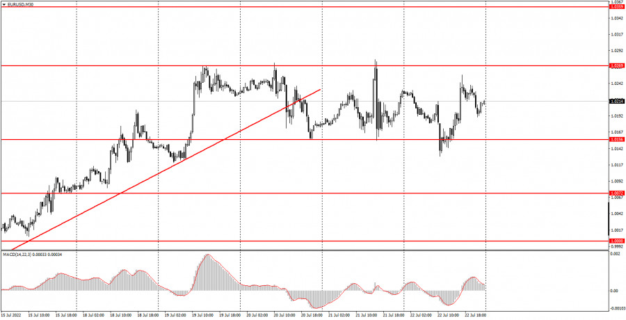How to trade on Monday:The upward trend has been formally canceled on the 30-minute timeframe. The euro could still rise, but it is much more likely, based on technical analysis, that the fall will resume. The market has, in principle, worked out the main driver of euro growth in the form of an increase in the European Central Bank key rate by 0.5%. Now it has to work out a Federal Reserve rate hike of at least 0.75%. On the 5-minute TF on Monday, it is recommended to trade at the levels of 1.0072, 1.0123, 1.0156, 1.0235, 1.0269-1.0277, 1.0354. When passing 15 points in the right direction, you should set Stop Loss to breakeven. No important reports will be published in the European Union and America on Monday. Therefore, the pair may remain inside the horizontal channel of 1.0156-1.0269 during the day. However, the Fed's meeting may start as early as Monday, as was the case with the ECB meeting this week. Therefore, you need to be ready for a strong movement.