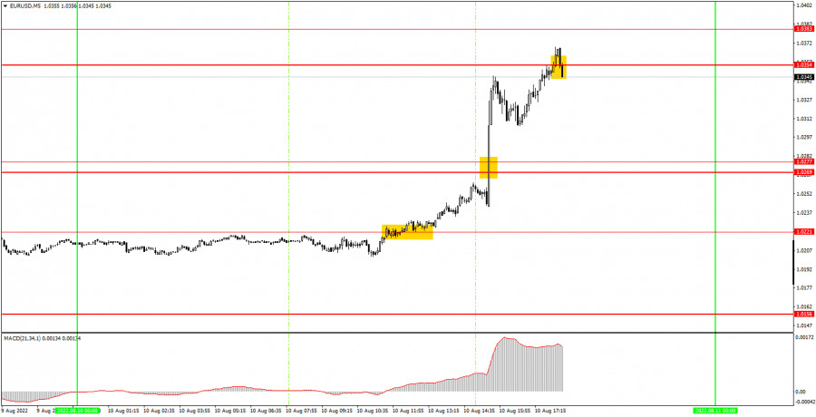 5M chart of the EUR/USD pairThe "flight" of the pair is clearly visible on the 5-minute timeframe. Today there were even a few revealing moments that should be analyzed. We always say that before important reports or events, it is better for novice traders to close all transactions and leave the market. However, today the situation was different. The first buy signal was formed near the level of 1.0221. The price went up 30 points at the opening of the US trading session, that is, on this transaction it was already possible to set Stop Loss to breakeven. Therefore, just before the release of the inflation report, it was possible not to exit a long position, since it was still impossible to get a loss on this transaction. As a result, the pair continued to rise and ended only near the level of 1.0354, which was reached in the late afternoon. Therefore, it was necessary to close long positions here, by at least 114 points in profit. The first two trading days of the week were not the most prosperous, but Wednesday made it possible for the newbies to win back their losses with a vengeance.