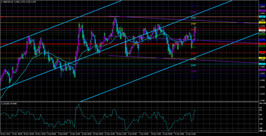 GBP/USD करेंसी पेअर में मंगलवार को तेजी से गिरावट आई, लेकिन इसने मंगलवार से बुधवार तक सभी नुकसानों की पूरी तरह से भरपाई कर ली। हालाँकि, इन गतिविधियों का वर्तमान तकनीकी तस्वीर के लिए बहुत कम महत्व है, क्योंकि ये सभी एक पार्श्व चैनल के भीतर घटित होते हैं जो एक महीने से अधिक समय से जारी है। एक महीने से अधिक समय से, यह जोड़ी 1.2610 और 1.2787 के स्तर के बीच कारोबार कर रही है, और अभी तक कोई संकेत नहीं मिला है कि कीमत इस सीमा से बाहर निकलने के लिए तैयार है।