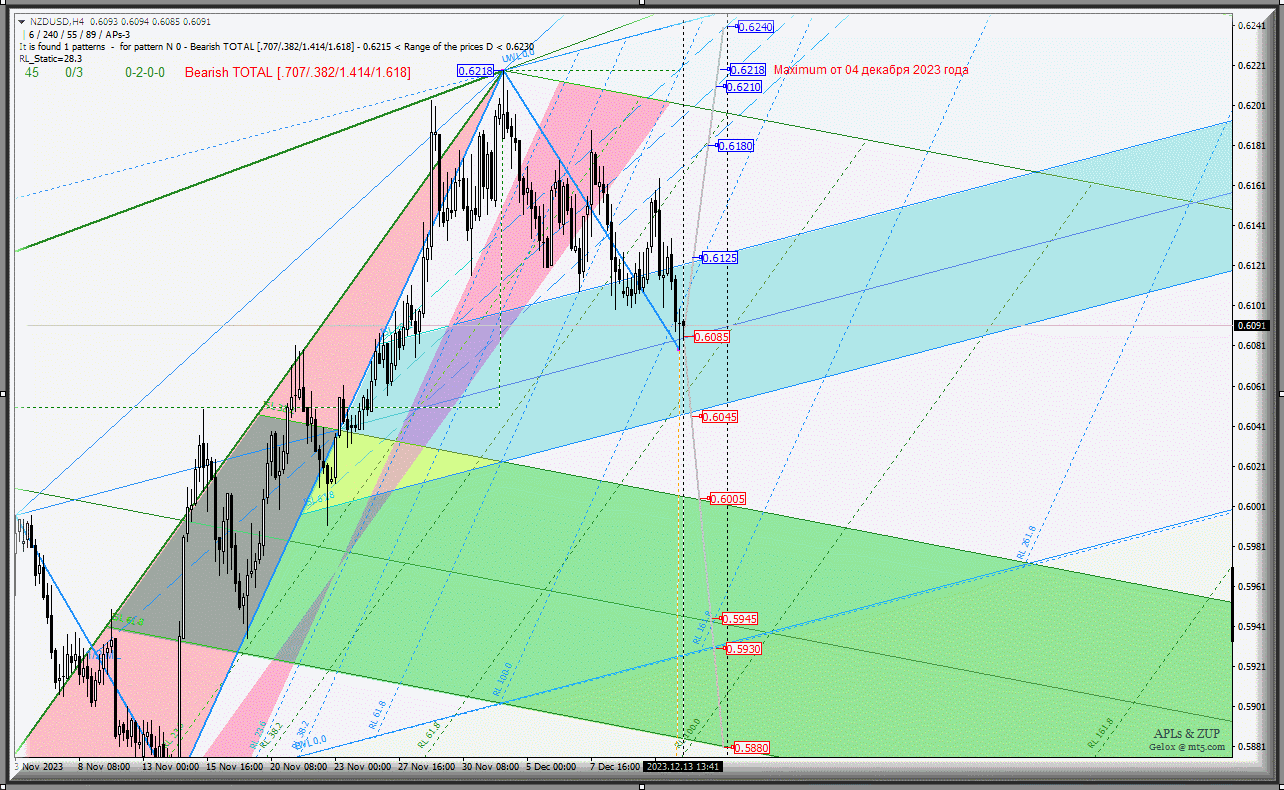 Новозеландский доллар - NZD/USD-h4 с 14 декабря 2023 г. станет развивать свое движение в соответствии с отработкой и направлением пробоя границ зоны равновесия (0.6125 - 0.6085 - 0.6045) вил младшего операционного масштаба Minuette-h1.