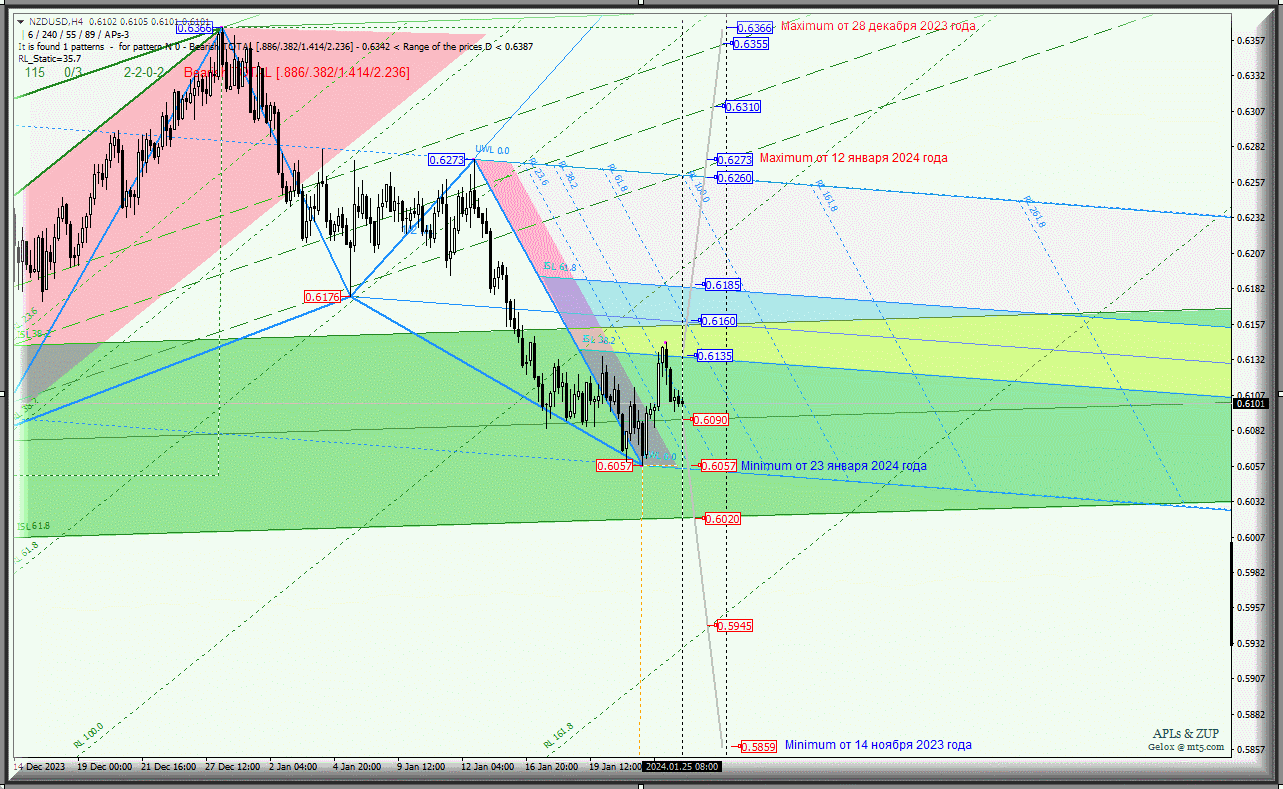 Новозеландский доллар - NZD/USD-h4 с 25 января 2024 года продолжит развитие своего движения в границах зон равновесия вил операционных масштабов - Minuette-h1 (0.6135 - 0.6160 - 0.6185) и Minute-h4 (0.6160 - 0.6090 - 0.6020) в соответствии с отработкой и направлением пробоя диапазона: