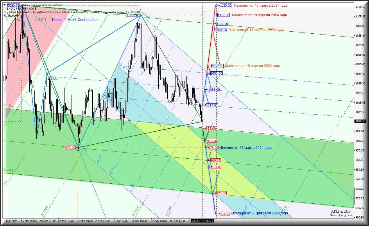 При возврате Palladium - Current Month выше (пробое) уровня сопротивления 1017.00 развитие движения Palladium - Current Month снова станет проистекать в канале 1/2 Median Line (1017.00 - 1033.00 - 1050.00) вил младшего операционного масштаба Minuette-h1 с возможной перспективой обновления maximum 1057.50 от 18 апреля 2024 года и достижение этим активом maximum 1094.50 от 12 апреля 2024 года.