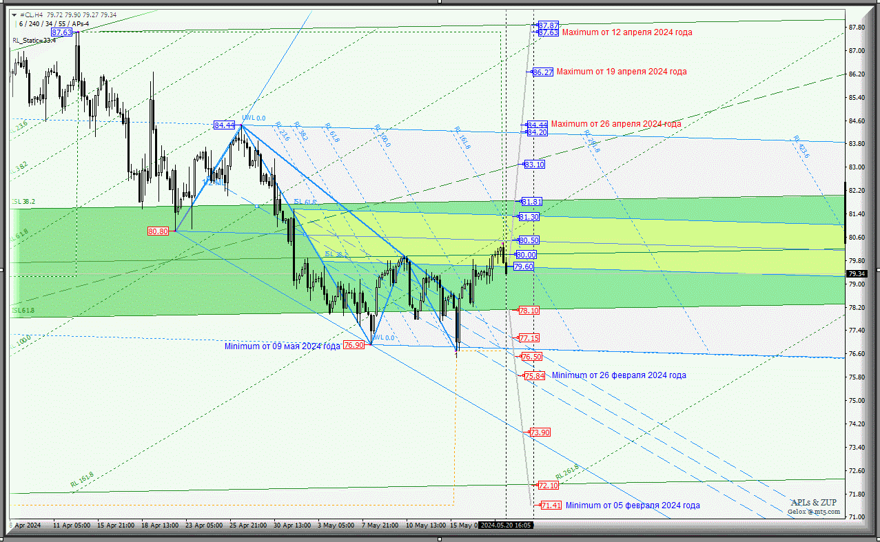 При пробое уровня сопротивления 79.60 на ISL38.2 Minuette-h1 движение #CL продолжится в зоне равновесия (79.60 - 80.50 - 81.30) вил младшего операционного масштаба Minuette-h1 с учетом отработки срединной линии Median Line Minute-h4 (80.00), а если случится совместный пробой ISL61.8 Minuette-h1 (81.30) и верхней границы ISL38.2 (81.81) зоны равновесия вил старшего операционного масштаба Minute-h4 - тогда восходящее движение этого инструмента может иметь продолжение к конечной линии FSL Minuette-h1 (84.20) и к maximum 84.44 от 26 апреля 2024 года.