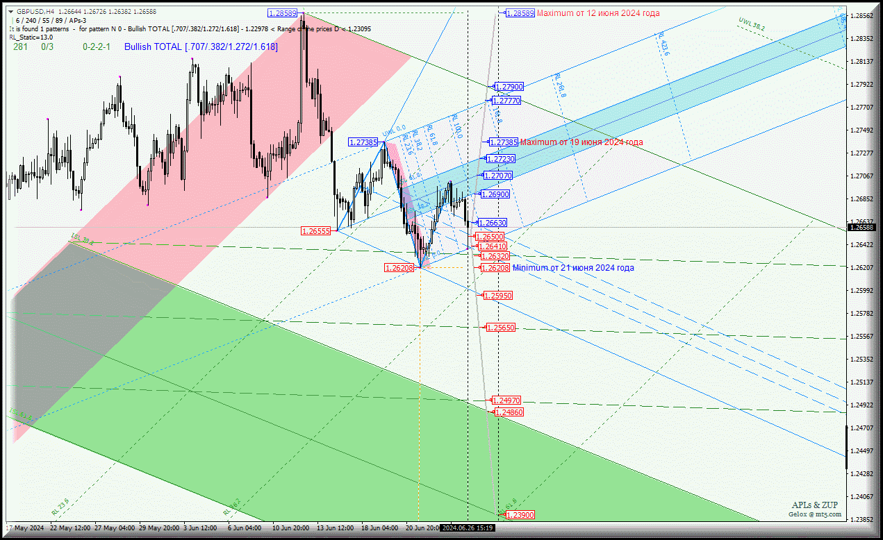 Развитие движения валюты Его Величества - GBP/USD-h4 с 27 июня 2024 года продолжится исходя из отработки и направления пробоя границ канала 1/2 Median Line (1.26630 - 1.26500 - 1.26410) вил младшего операционного масштаба Minuette-h1.