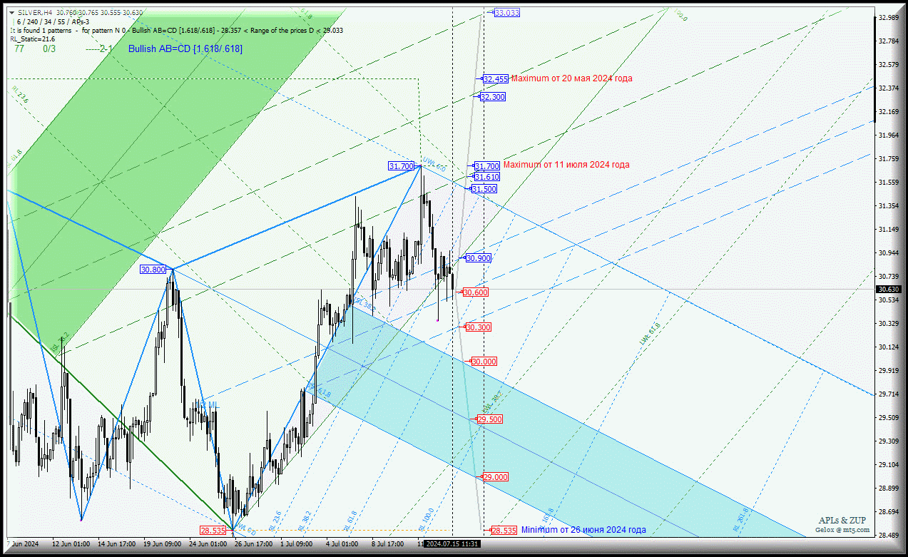 Spot Silver-h4 c 15 июля 2024 года продолжит свое движение в соответствии с отработкой и направлением пробоя границ канала 1/2 Median Line (30.900 - 30.600 - 30.300) вил младшего операционного масштаба Minuette-h1.