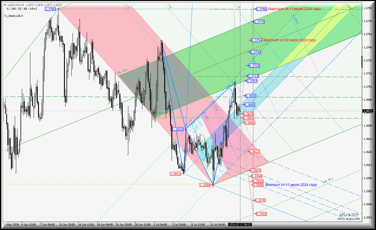 Развитие движения канадского доллара - USD/CAD-h4 с 17 июля 2024 г. будет обусловлено границами канала 1/2 Median Line (1.3665 - 1.3690 - 1.3713) вил старшего операционного масштаба Minute-h4, а продолжится это движение исходя из отработки и направления пробоя границ зоны равновесия (1.3660 - 1.3670 - 1.3680) вил младшего операционного масштаба Minuette-h1.