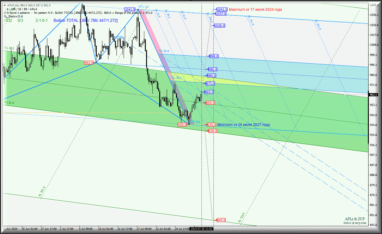 С 31 июля 2024 года развитие движения #PLF будет зависеть от отработки и направления пробоя границ канала 1/2 Median Line (955.0 - 965.0 - 973.0) вил младшего операционного масштаба Minuette-h1.