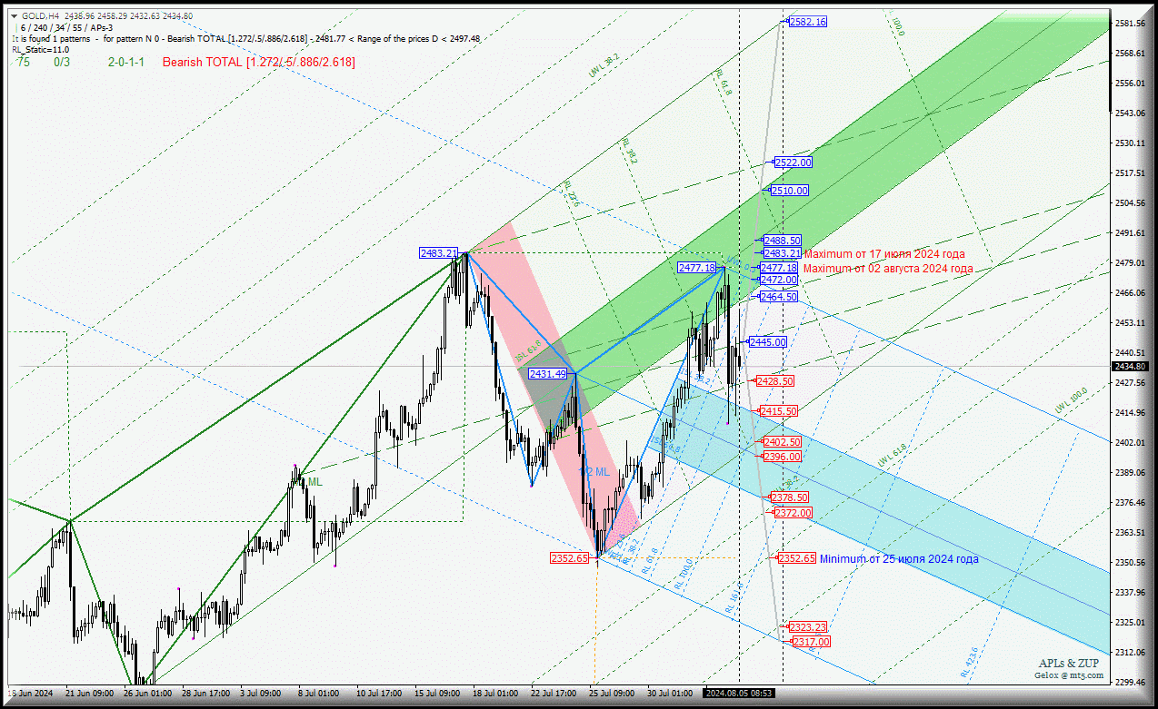 Движение Spot Gold-h4 с 05 августа 2024 года станет определяться отработкой и направлением пробоя границ канала 1/2 Median Line (2428.50 - 2445.00 - 2464.50) восходящих вил старшего операционного масштаба Minute-h4.