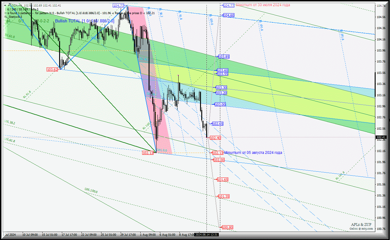 Индекс доллара - #USDX-h4 с 15 августа 2024 года станет развивать свое движение в соответствии с отработкой и направлением пробоя границ канала 1/2 Median Line (102.13 - 102.40 - 102.65) вил младшего операционного масштаба Minuette-h1.