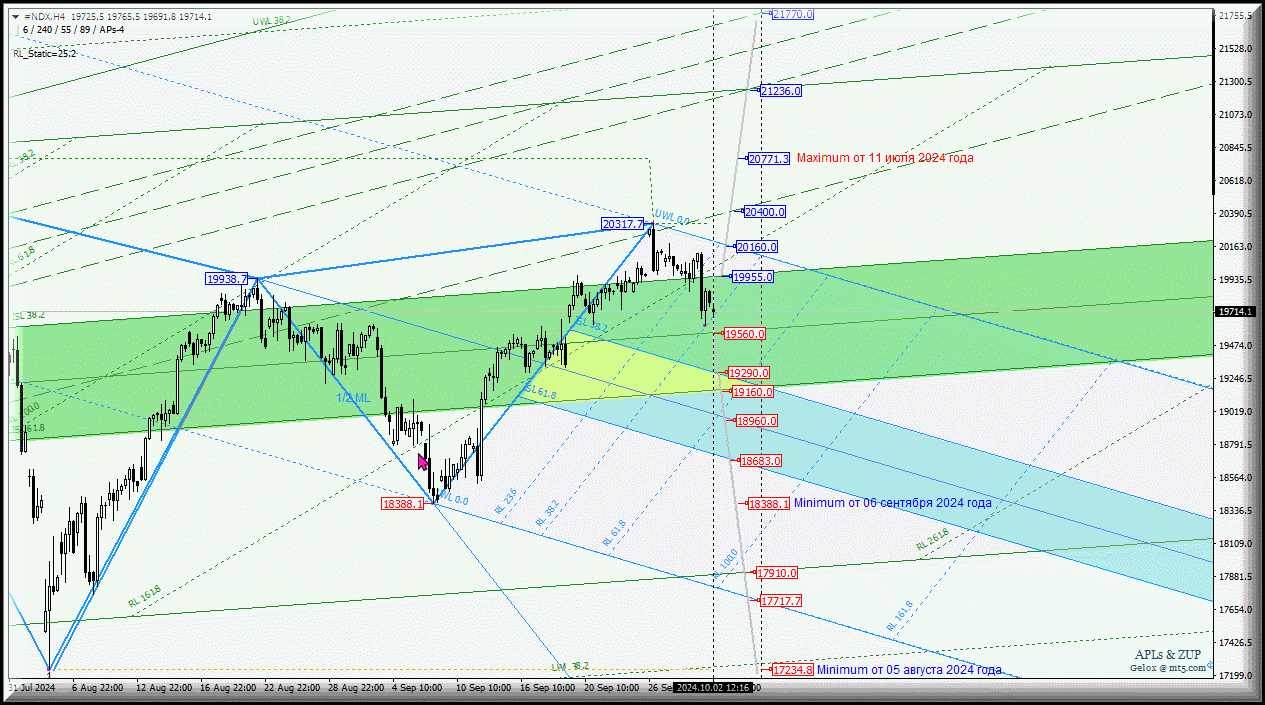 Движение NASDAQ-100 с 03 октября 2024 года продолжится в зависимости от отработки и направления пробоя границ зоны равновесия (19160.0 - 19560.0 - 19955.0) вил старшего операционного масштаба Minute-h4.